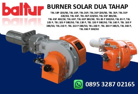 Pembakar minyak ringan/ Burner Solar BTL P Operasi: dua tahap, Emisi NOx dan CO rendah. Pembakar minyak ringan sesuai standar Eropa EN267: kelas 2, Menyetel kepala pembakaran., Perawatan dipermudah dengan kemungkinan melepas unit pencampur tanpa harus melepas pembakar dari boiler. , Flensa kopling boiler geser untuk menyesuaikan pipa peledak dengan berbagai jenis boiler. , Intake udara pembakaran dengan katup kupu-kupu.