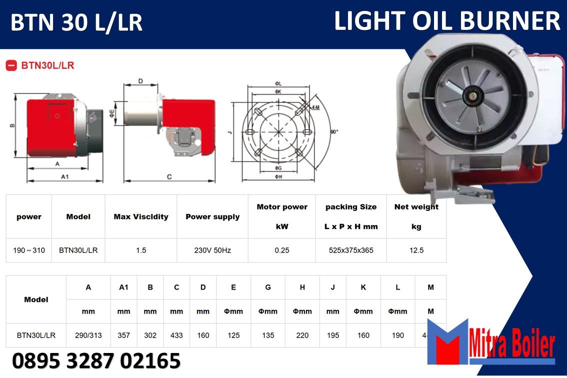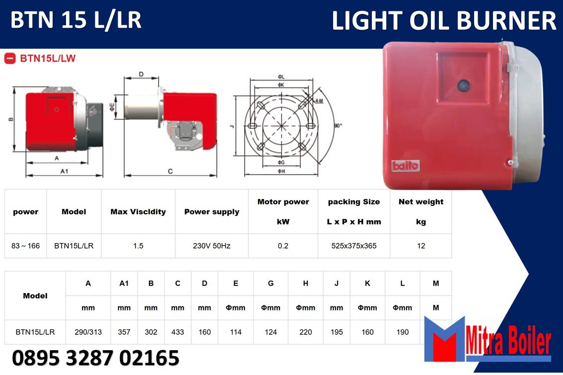 Burner Baite BTN BTN15/20/30L/LR adalah Pembakar minyak ringan/ Solar sistem Operasi Satu tahap (hidup/mati) untuk Type L, dan Dua Tahap Pembakaran Untuk Type LR dengan rentang kapasitas mulai 83 – 310 kW; Penyemprot Tekanan Mekanis Dengan Fotosel periksa apinya Dengan satu flensa dan satu flensa- ulated lingkaran kedap udara untuk dipasang pada boiler.