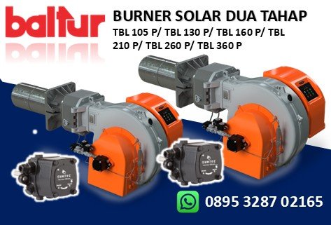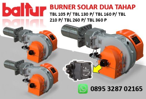 BURNER SOLAR BALTUR TBL 105 P/130 P/160 P/210 P/260 P/ 360 P Adalah Pembakar minyak ringan dengan emisi NOx dan CO rendah sesuai standar Eropa EN267 kelas 2, Untuk Menyetel kepala pembakaran sebagai Perawatan dipermudah dengan kemungkinan melepas unit pencampur tanpa harus melepas pembakar dari boiler. Memiliki Efisiensi ventilasi tinggi, input listrik rendah, kebisingan rendah. Flensa kopling boiler geser untuk menyesuaikan pipa peledak dengan berbagai jenis boiler, Intake udara pembakaran dengan katup kupu-kupu. Pengaturan aliran udara: cam mekanis dongkrak hidrolik, Peredam udara yang menutup sepenuhnya saat dimatikan untuk mencegah hilangnya panas melalui cerobong asap.