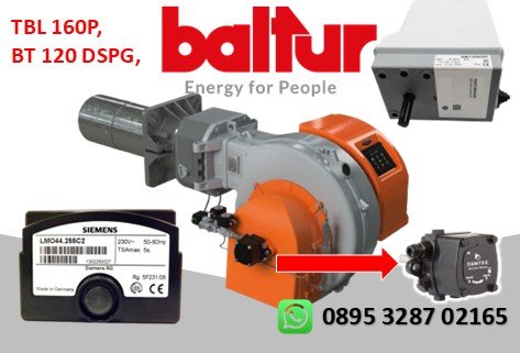 Burner Baltur TBL 160P Adalah Mesin Pembakar minyak ringan/Solar dengan Operasi satu tahap, dua tahap dengan kapasitas Thermal Yang di Keluarkan 510-1600 kW. Pembakar minyak ringan. Operasi: mekanis dua tahap, dua tahap progresif Rasio modulasi: 1:2 Emisi NOx dan CO rendah, pembakar minyak ringan sesuai standar Eropa EN267 kelas 2. Kelebihan Burner ini Menyetel kepala pembakaran/Perawatan dipermudah dengan kemungkinan melepas unit atau tanpa harus melepas pembakar dari boiler.